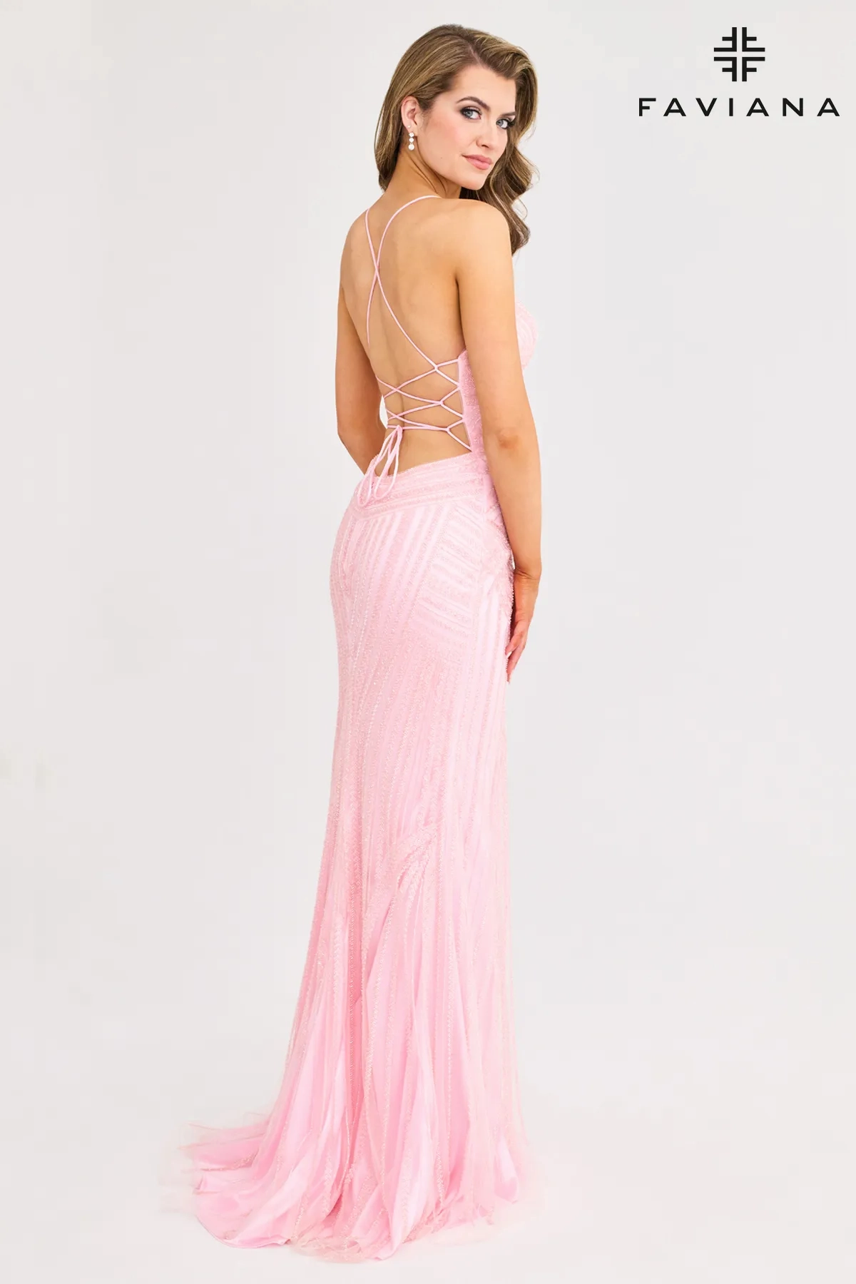 Glamorous Beaded V-Neck Gown With Lace-Up Back