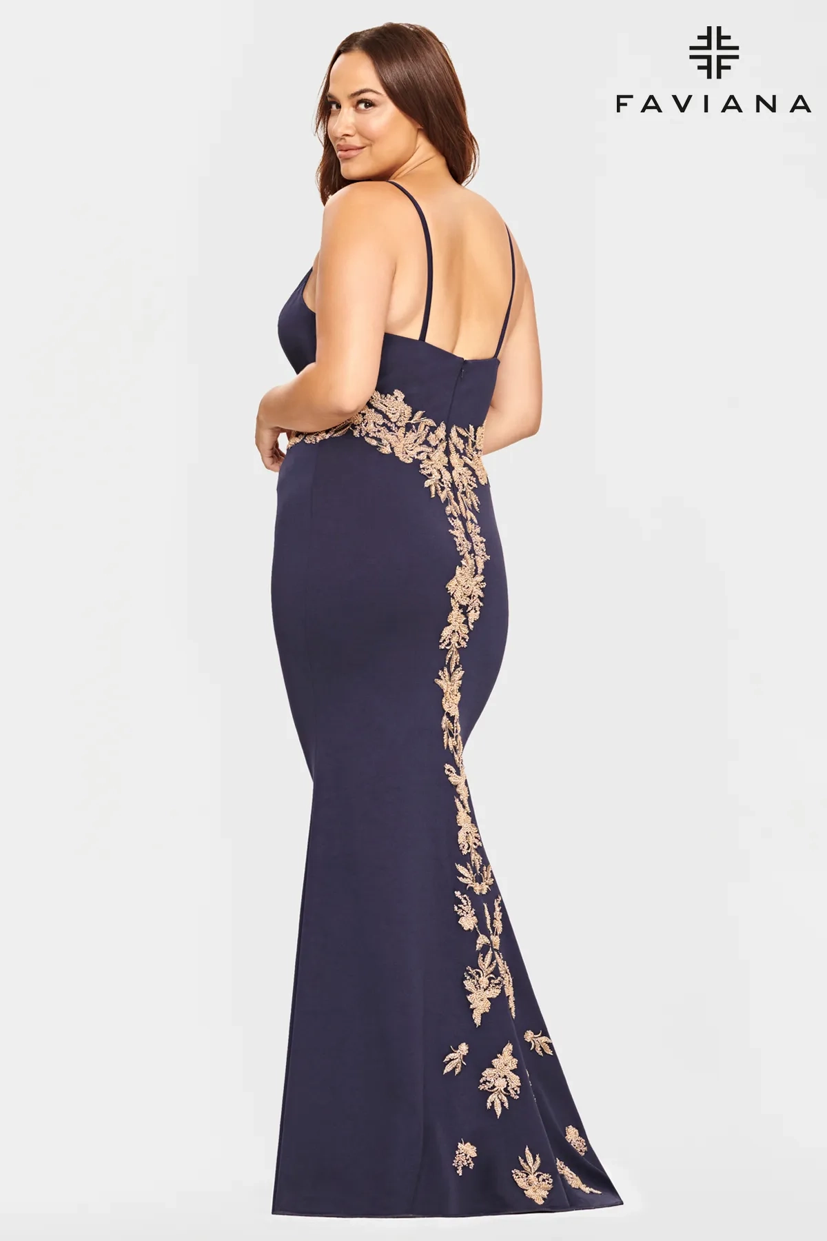Long Heavy Jersey V-Neck Dress Featuring Applique On Side Bodice And Down The Center Back Skirt With An Invisible Zipper And Hook & Eye Closure