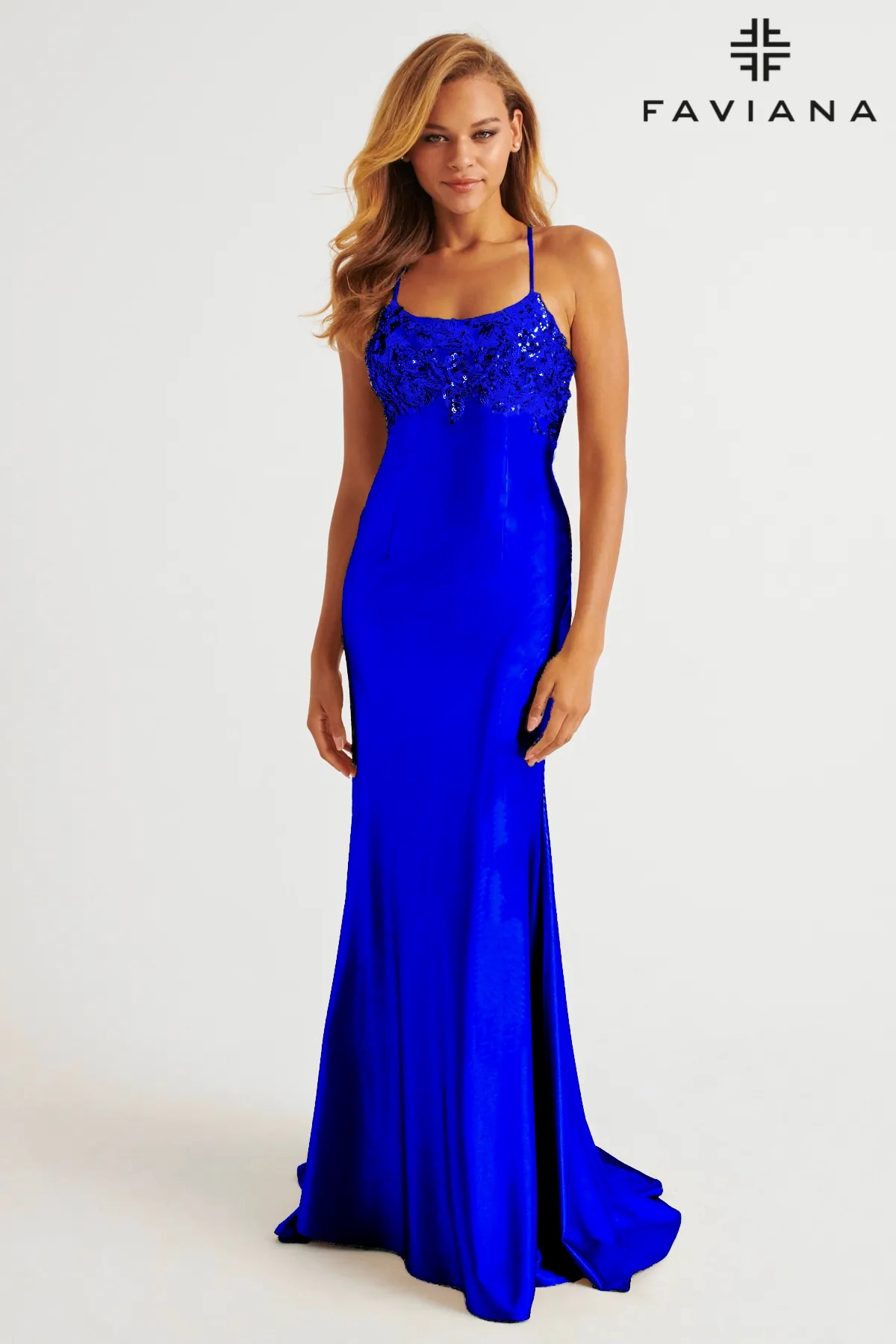 Satin Scoop Neck Dress With Sequin Applique And Lace Up Back